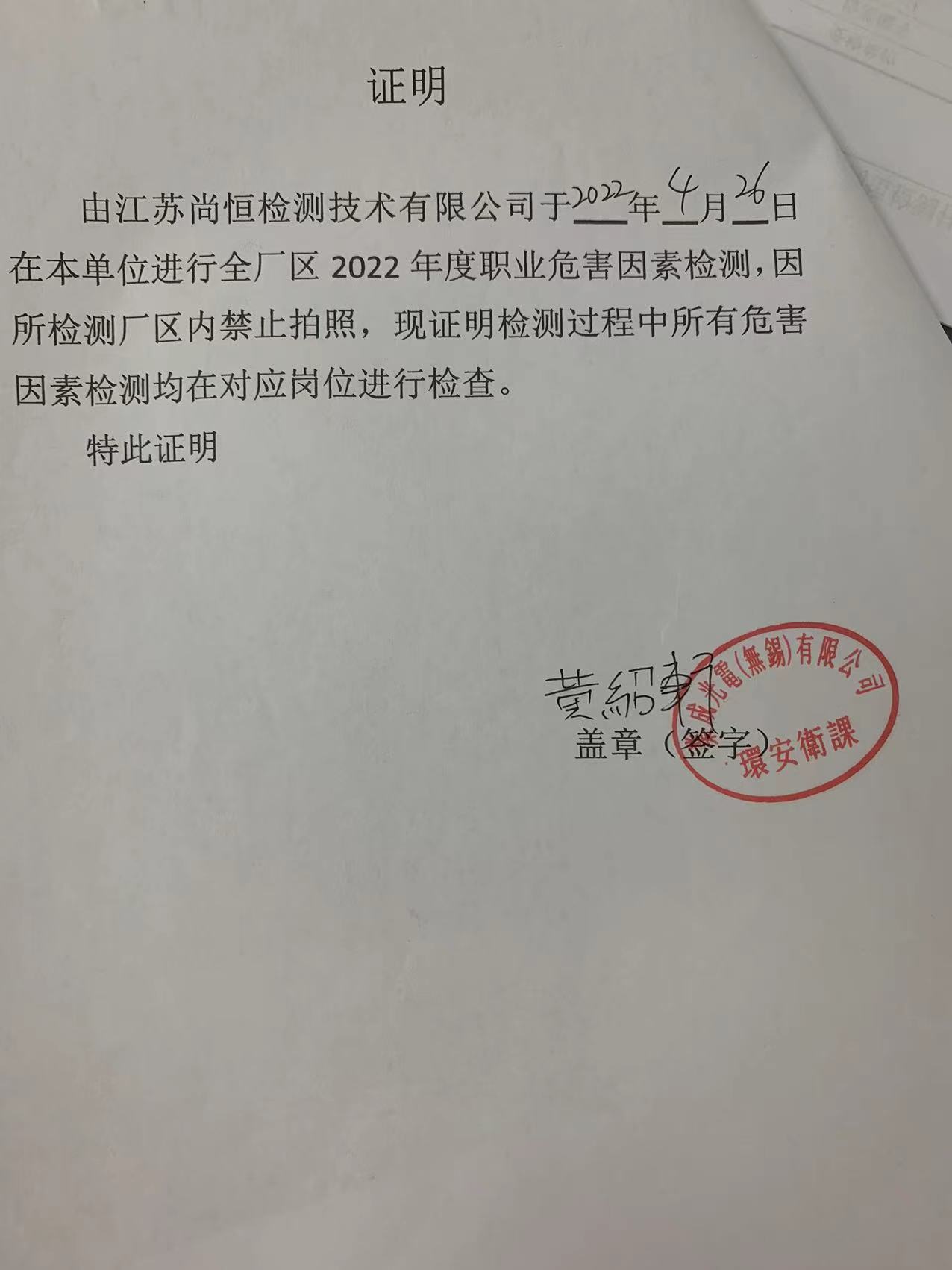 用人單位名稱 無錫順益不銹鋼有限公司 用人單位注冊地址 無錫市東北塘華眾玻璃廠17-18號 聯(lián)系人 胡林紅 報告名稱及編號 職業(yè)病危害因素檢測報告 Z20251011 項目組人員 耿朔辰、方佐、朱娟、崔琳杰 現(xiàn)場調(diào)查人員 耿朔辰、方佐 現(xiàn)場調(diào)查時間 2025年10月3日 用人單位陪同人 胡林紅 采樣與測量人員 朱娟、崔琳杰 采樣與測量時間 2025年11月25日 用人單位陪同人 胡林紅 現(xiàn)場照片(現(xiàn)場調(diào)查及現(xiàn)場采樣與測量照片,含企業(yè)名稱或標(biāo)識的合影照片) ? ? ? ? ?...