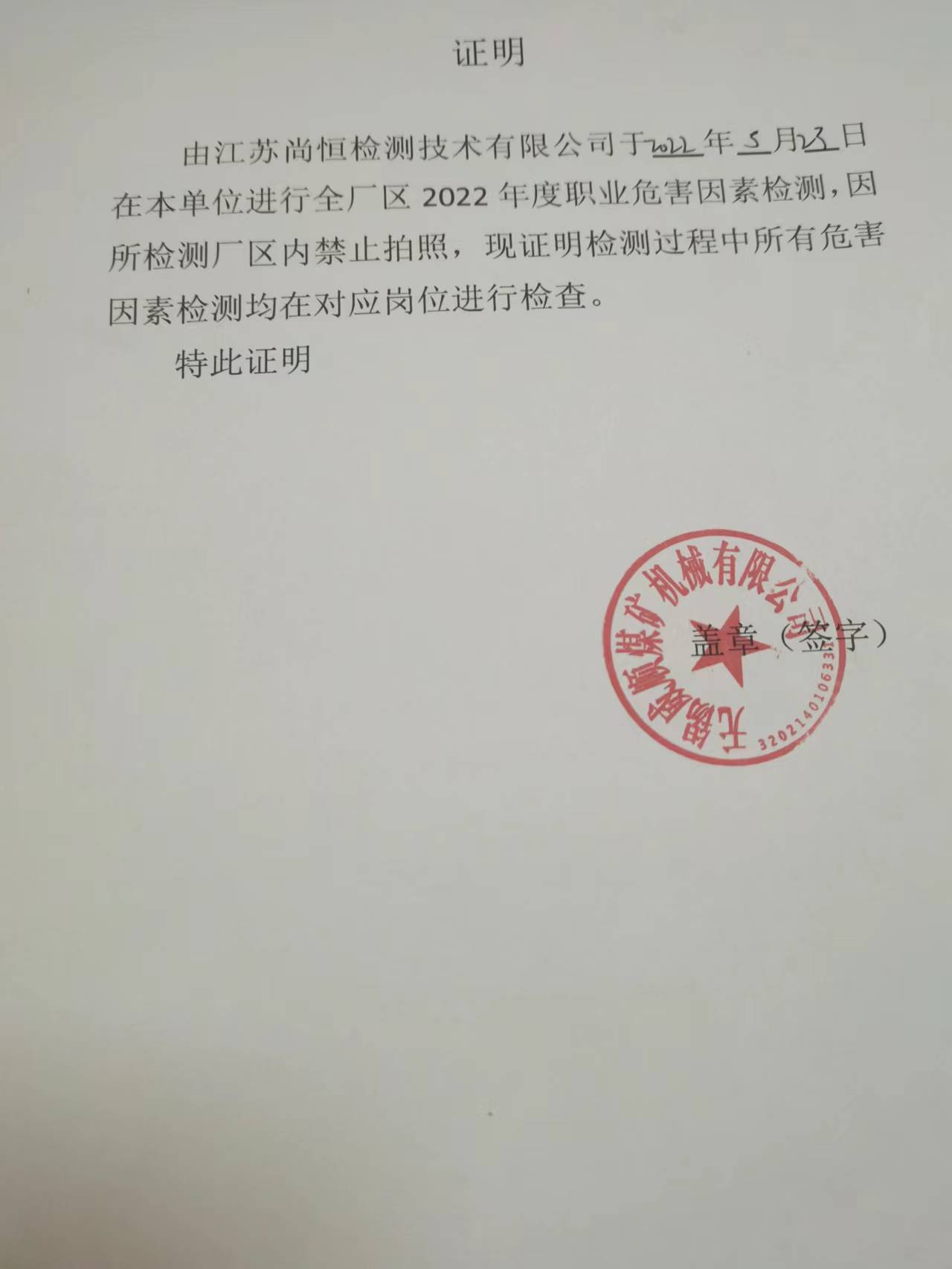 用人單位名稱 無錫久高機(jī)械有限公司 用人單位注冊(cè)地址 無錫市胡埭鎮(zhèn)景天路8號(hào) 聯(lián)系人 熊燕燕 報(bào)告名稱及編號(hào) 職業(yè)病危害因素檢測(cè)報(bào)告 Z20251169 項(xiàng)目組人員 丁文輝、郭佳、崔琳杰、朱娟 現(xiàn)場(chǎng)調(diào)查人員 丁文輝、郭佳 現(xiàn)場(chǎng)調(diào)查時(shí)間 2025年11月19日 用人單位陪同人 熊燕燕 采樣與測(cè)量人員 崔琳杰、朱娟 采樣與測(cè)量時(shí)間 2025年11月28日 用人單位陪同人 熊燕燕 現(xiàn)場(chǎng)照片(現(xiàn)場(chǎng)調(diào)查及現(xiàn)場(chǎng)采樣與測(cè)量照片,含企業(yè)名稱或標(biāo)識(shí)的合影照片) ? ? ? ? ?...