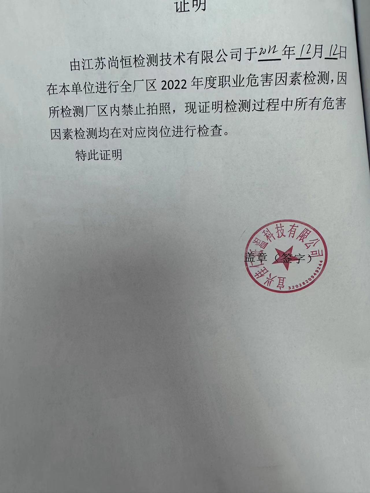 用人單位名稱 江蘇興鵬制衣有限公司 用人單位注冊地址 無錫市東港鎮(zhèn)湖塘橋村 聯(lián)系人 顧海平 報告名稱及編號 職業(yè)病危害因素檢測報告 Z20251118 項目組人員 耿朔辰、方佐、周康、尚志華 現(xiàn)場調查人員 耿朔辰、方佐 現(xiàn)場調查時間 2025年11月12日 用人單位陪同人 顧海平 采樣與測量人員 周康、尚志華 采樣與測量時間 2025年12月1日 用人單位陪同人 顧海平 現(xiàn)場照片(現(xiàn)場調查及現(xiàn)場采樣與測量照片,含企業(yè)名稱或標識的合影照片) ? ? ? ? ?...
